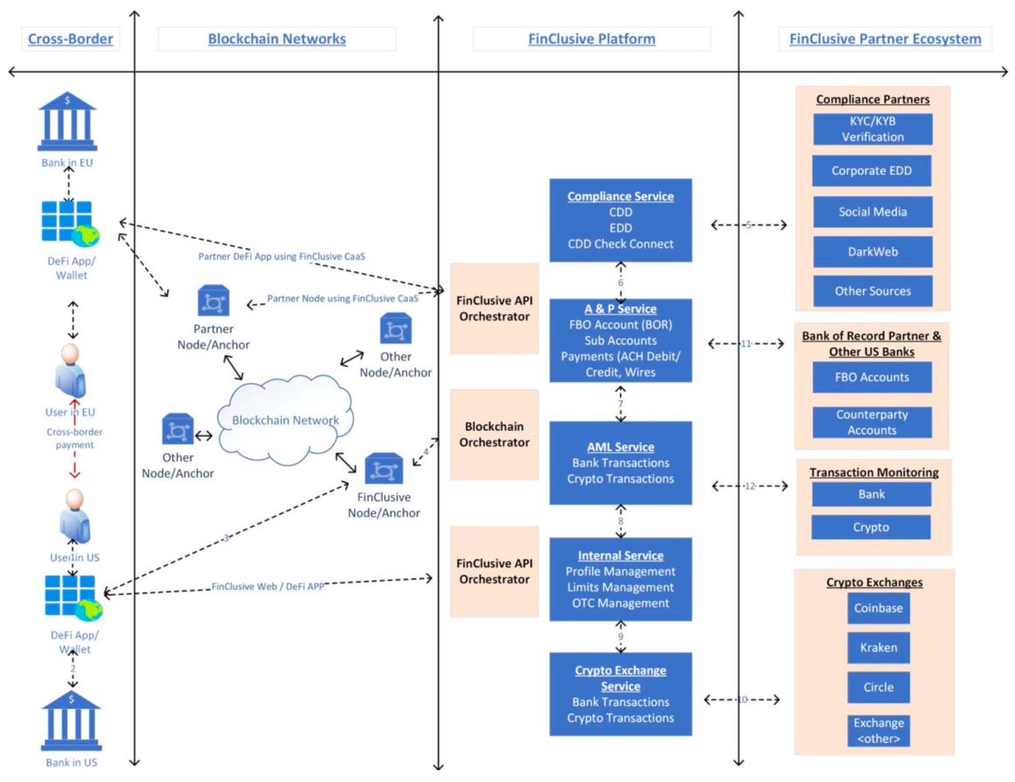 Additionally, FinClusive can on/off ramp payments between virtual assets (e.g. USDC, cUSD) with USD fiat, whereby FinClusive’s integration with exchanges and VASPs such as Coinbase, Kraken, Circle or virtual asset over the counter (OTC liquidity providers) provide the actual exchange of virtual assets with USD fiat funds. The use of client sub-accounts is not required to use the FBO account. An overall architecture of the combined CaaS and A&P applications and FinClusive’s integration with our BoRs, virtual asset exchanges and blockchain networks and other ecosystem partners is provided below.