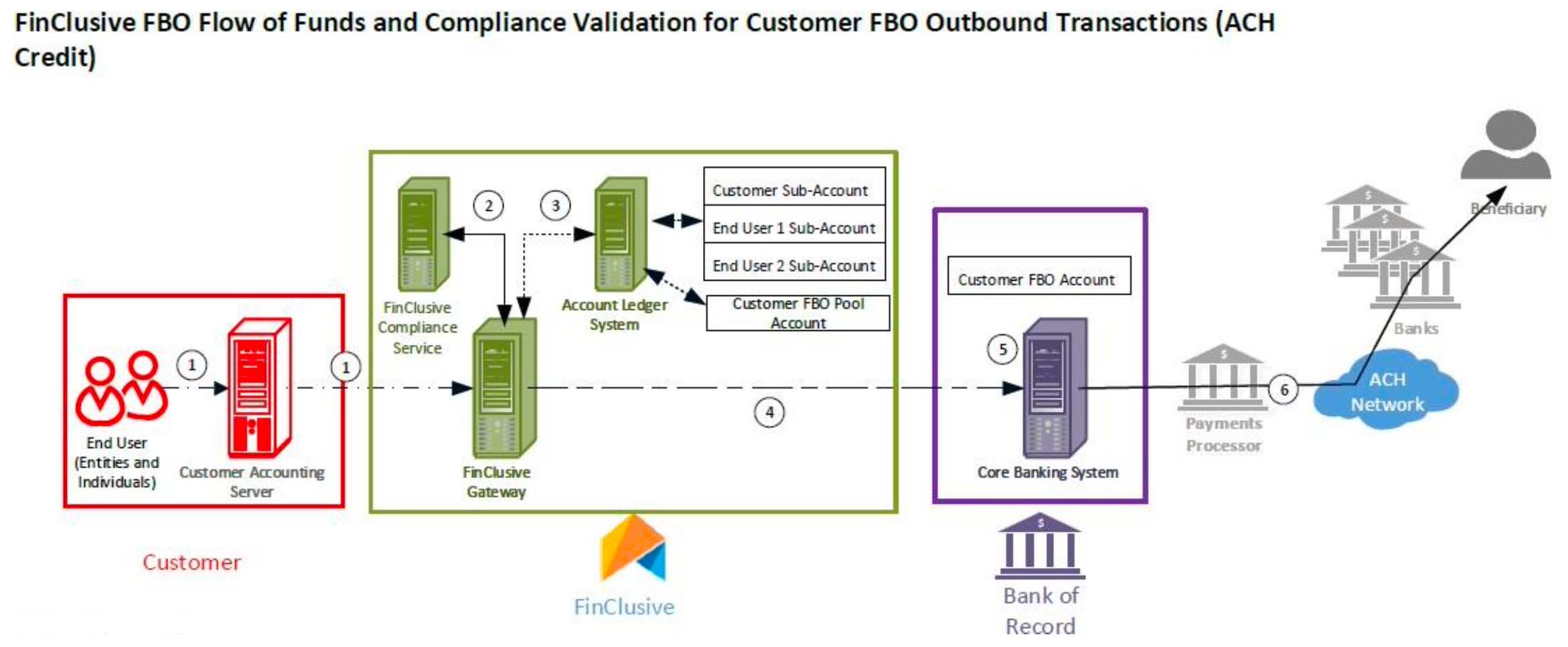 As such, Vesto may use the FBO account dedicated to it to receive deposits or make payments to external counterparties via ACH, or US domestic wire. In addition, Vesto may transfer funds to their client sub-accounts and execute payments on behalf of their clients to other clients or external counterparties. Funds transfers via ACH/wire are executed by FinClusive’s BoR. An example funds flow is depicted below. (NB: At present, with respect to ACH transfers, the inbound transfer of funds to sub- accounts via ACH can only be done via ACH Debits. FinClusive’s BORs do not currently support assigning ABA routable numbers to sub-accounts).